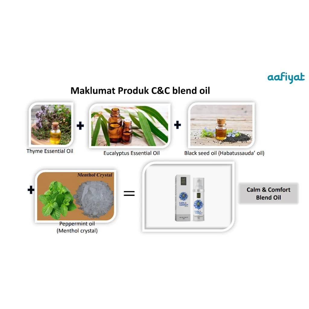 Terbaru Calm and Comfort Blend Oil (CnC Blend Oil) kini dibawakan eksklusif buat anda, dengan campuran istimewa: Minyak habatus sauda’ (Black seed oil), pati minyak thyme dan eucalyptus.